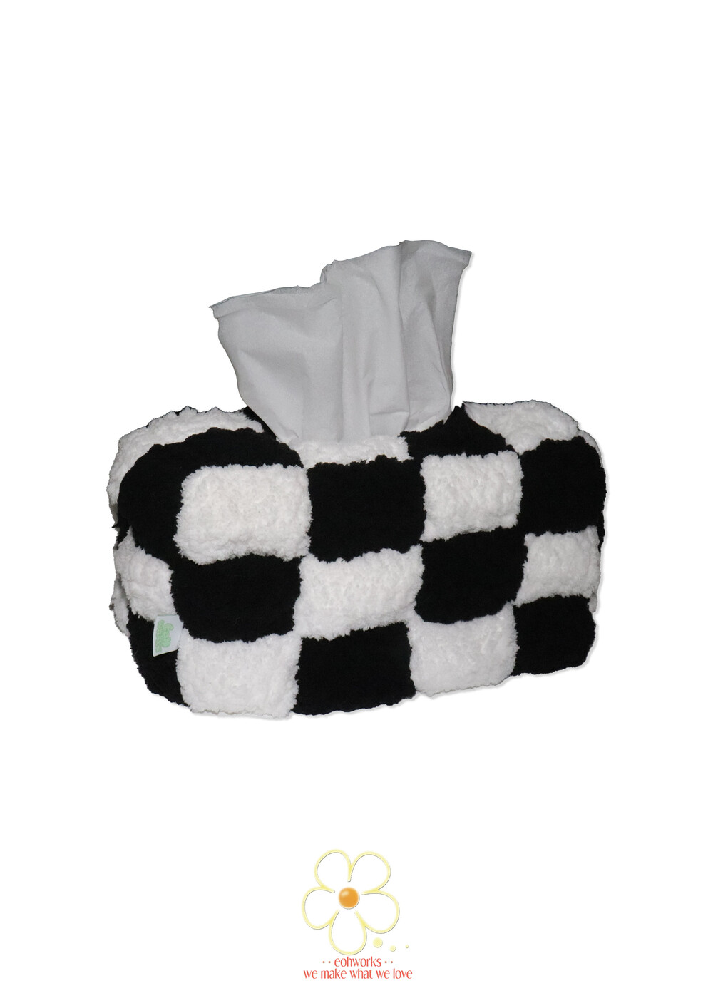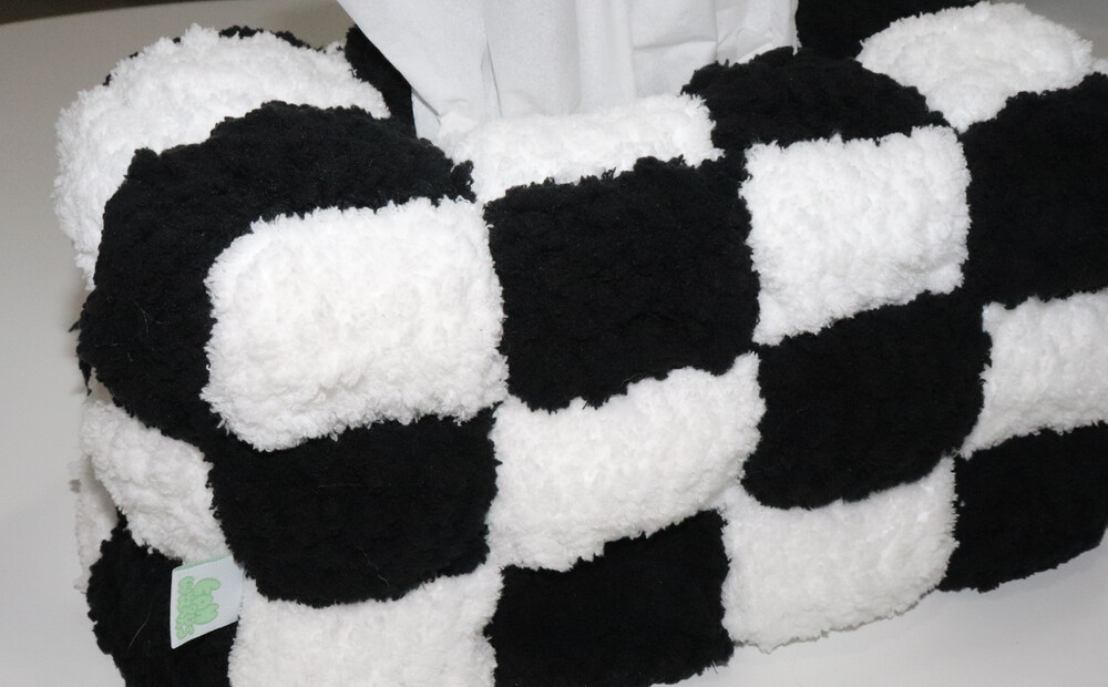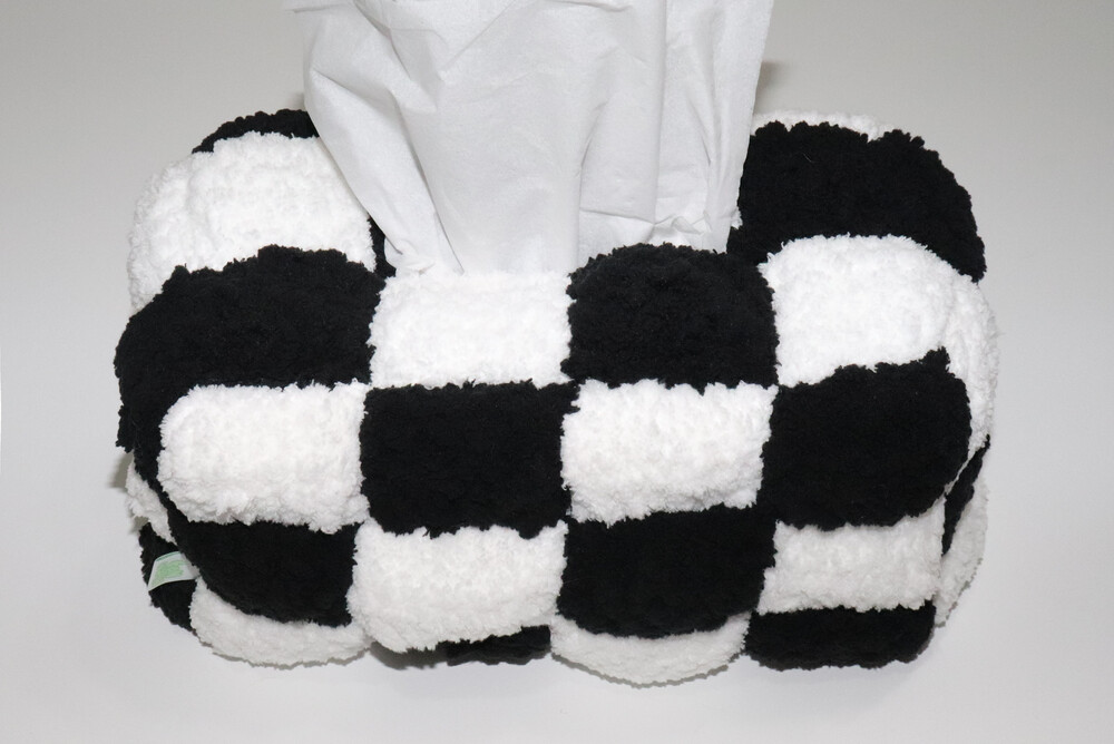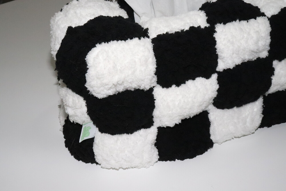 포근해 보이는 수면사로 제작된 블랙 & 화이트 조합의 체커보드 티슈 케이스입니다.