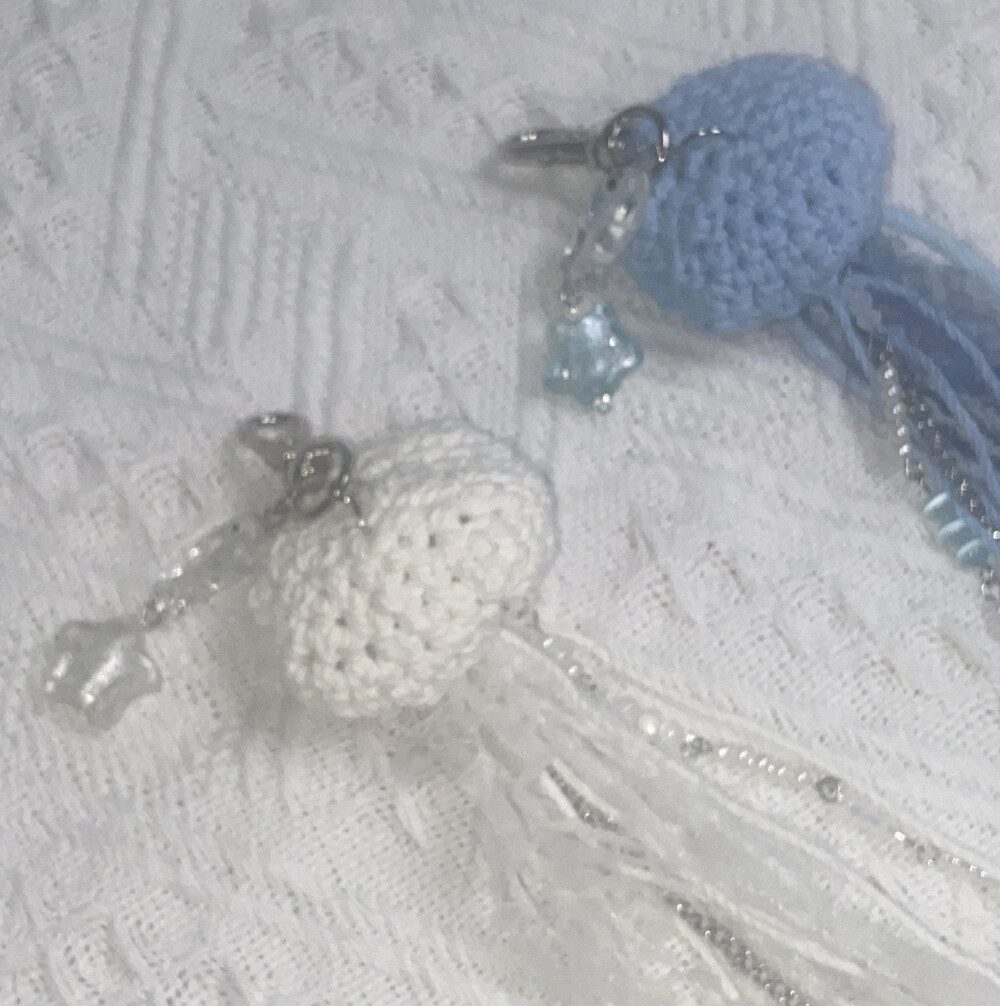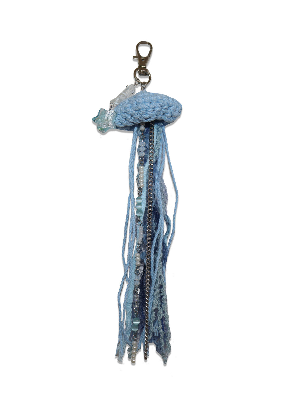 몽글몽글 하늘색의 헤어리한 원사로 만들어진 해파리 모양의 키링입니다.
