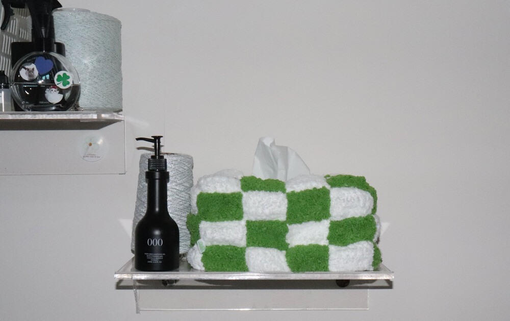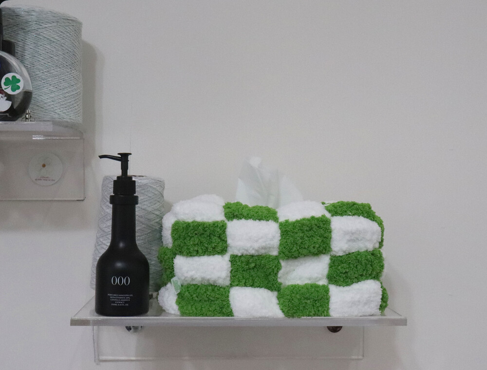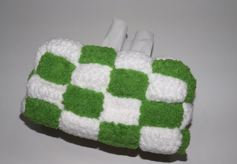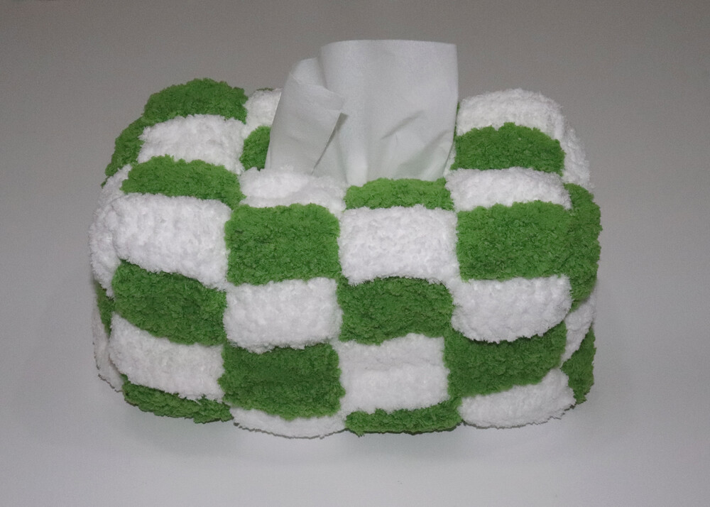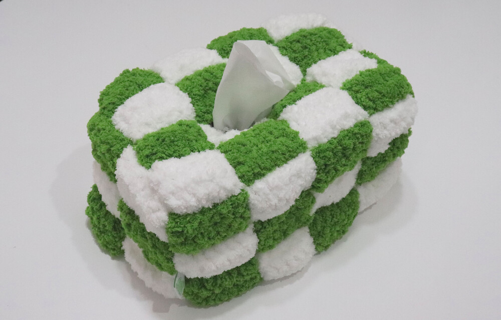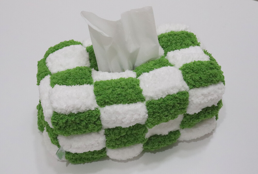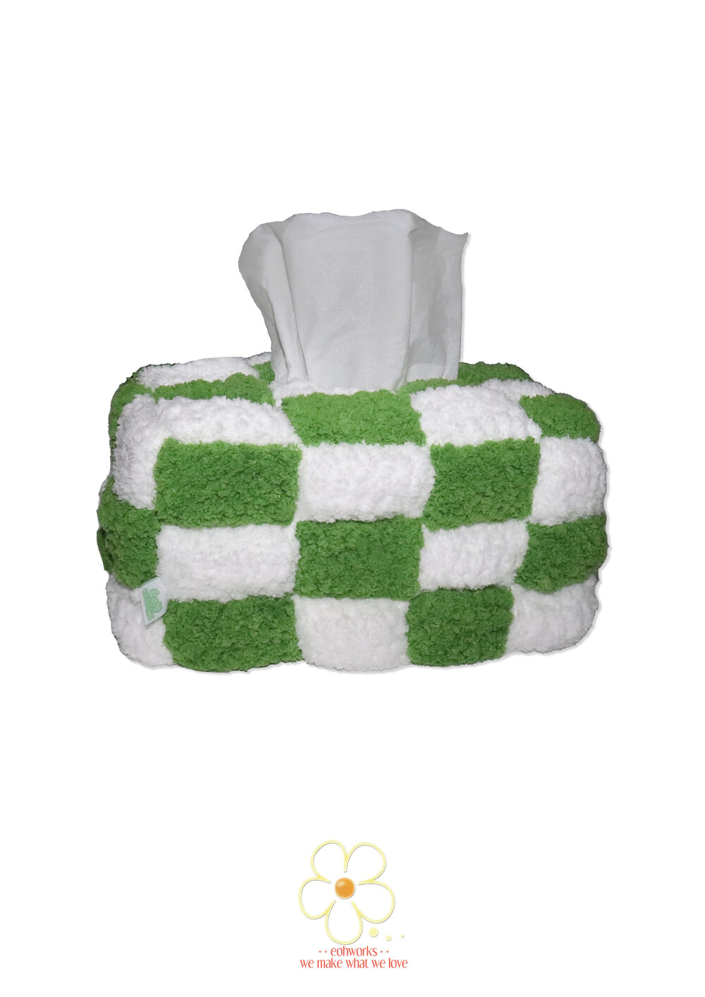 포근해 보이는 수면사로 제작된 그린 & 화이트 조합의 체커보드 티슈 케이스입니다.