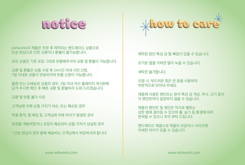 - EOHWORKS는 핸드메이드 악세사리 브랜드로 모든 상품의 재고를 두고 판매하고 있지 않습니다.