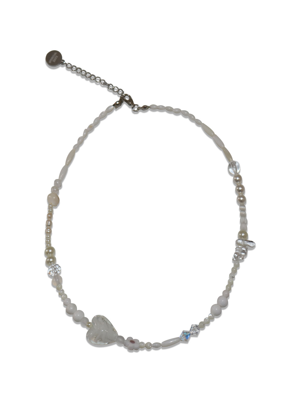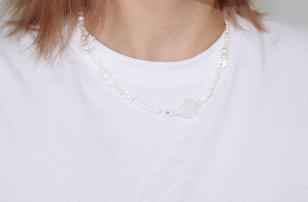 흰색을 내는 다양한 원석을 사용하여 만들어진 목걸이입니다.
